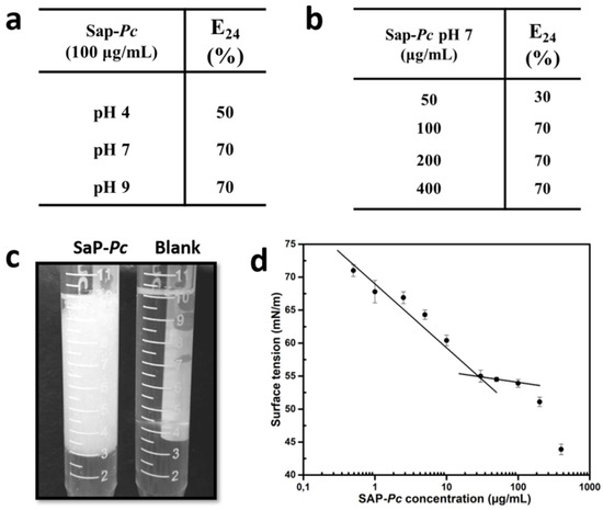 (a) Table of E24 values of 100 µg/mL of SAP-Pc at different pHs in the presence of Dectol; (b) table of E24 values of SAP-Pc dissolved at pH 7 at different concentrations in the presence of Dectol. All results are averages from three replicate experiments and the standard deviation is less than 10%. (c) Emulsion of 100 µg/mL SAP-Pc in 10 mM phosphate buffer at pH 7 (4 mL) mixed to 6 mL of Dectol after 24 h, in comparison to the mixture of buffer and Dectol, in the absence of the protein. (d) graph of surface tension of SAP-Pc in 10 mM phosphate buffer at pH 7 as function of protein concentration.