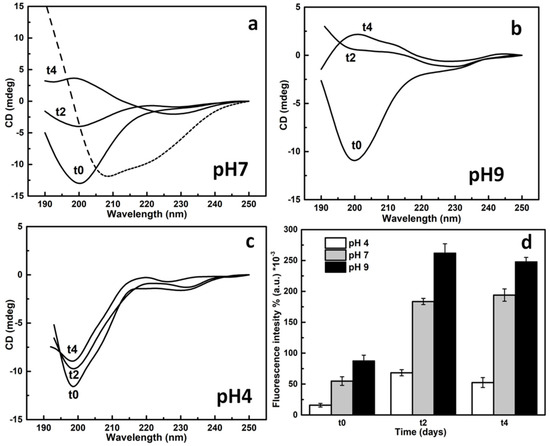 Circular dichroism (CD) spectra of SAP-Pc (100 μg/mL) dissolved in aqueous buffers at pH 7 (a), pH 9 (b), and pH 4 (c), just after dissolution (t0) and after 2 and 4 days. The dotted line in panel a corresponds to the spectrum of the protein in 60% ethanol; (d) ThT assay: fluorescence intensity of the same samples in the presence of 30 μM ThT.