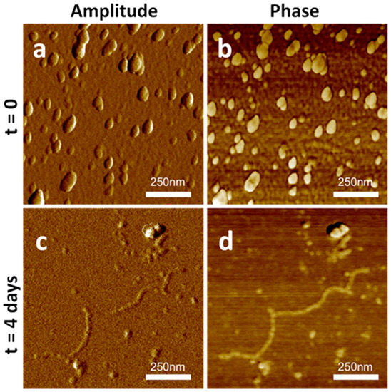 Taking into consideration that these structural changes led to a higher contribution of β structures (e.g., see the spectrum after 4 days at pH 7), the formation of amyloid-like fibrils can be envisaged. The fluorescent dye thioflavin-T (ThT), typically used to detect the presence of amyloid fibrils, was used to verify their formation. A significant increase of the ThT fluorescence intensity was observed at neutral and alkaline pHs during a period of one week (Figure 3d). To confirm the formation of amyloid-like structures, atomic force microscopy (AFM) analysis of SAP-Pc was performed, just after dissolution in aqueous buffer at pH7 (t0), and after 4 days (Figure 4). At t0, ellipsoidal protein aggregates were observed (54 ± 30 nm), whereas fibrils were detected in samples 4 days after dissolution. Their length was more than 1 µm, the medium width was 30nm, and their shape looked like an alignment of aggregates.