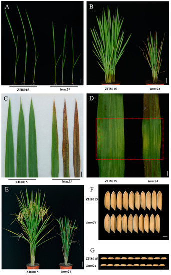 Phenotypic analyses of lmm24. (A) Comparison of growing situation ZH8015 and lmm24 at seedling stage (15 days post-sowing (dps)). (B) lmm24 plant at tillering stage (50 dps) display dark brown lesions. (C) Lesion mimic phenotype in lmm24 and clean leaf blade in ZH8015. (D) Determination of whether the lmm24 phenotype was light dependent. The area covered with aluminum was indicated by red rectangle frame. (E) ZH8015 and lmm24 plants at harvest period (F) Grain width observation of lmm24 and ZH8015. (G) Grain length observation of lmm24 and ZH8015. Scale bar: 2 cm in (A,C), 1 cm in (D,F,G), 10 cm in (B,E).