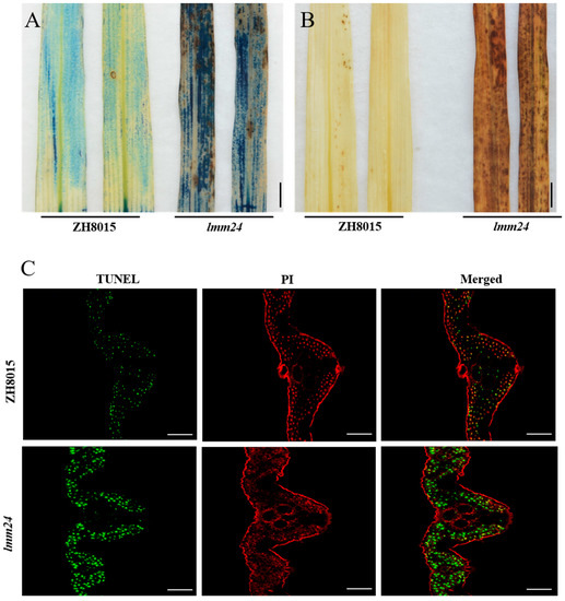 We speculated that the lesion phenotype of LMMs is the result of ROS accumulation leading to cell death. Thus, we investigated ROS accumulation and cell death in lmm24 leaves. Evans blue solution can enter cells undergoing death but cannot enter living cells, so Evans blue staining is a histochemical indicator of cell death. The reagent 3,3′-diaminobenzidine (DAB) was used to indicate the accumulation of hydrogen peroxide (H2O2). Histochemical staining results showed that lmm24 had many Evans blue spots after staining, whereas ZH8015 did not (Figure 2A), indicating mass cell death in lmm24. Comparing DAB staining between the mutant and ZH8015, we found that lmm24 had much stronger H2O2 accumulation than ZH8015 (Figure 2B). Terminal deoxynucleotidyl transferase dUTP nick end labelling (TUNEL) assay is another method to detect cell death. When the cell dies, the DNA breaks and the exposed 3’-OH can be added to fluorescein by the TUNEL reagent, which can be detected by fluorescence microscopy. Our TUNEL assay carried out to detect DNA fragmentation in lmm24 and ZH8015 indicated stronger TUNEL signals were detected in the leaves of lmm24 (Figure 2C), which also suggests that there was much more cell death in lmm24.