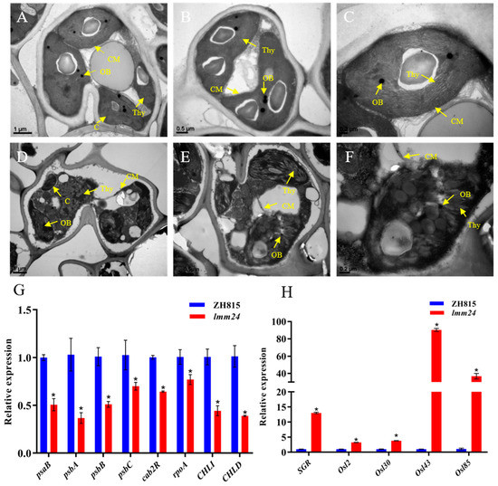Qualitative TEM observation and genes expression analysis. (A–C) Observation of chloroplasts in ZH8015 mesophyll cells by TEM. C: chloroplast; Thy: thylakoid lamellae; OB: osmiophilic body; CM: chloroplast membrane. (D–F) Observation of chloroplasts in lmm24. (G) Expression levels of photosynthesis-related genes. β-actin1 as a reference gene. (H) Expression levels of SGR gene and senescence-associated genes, β-actin1 as a reference gene. The expression level of each gene in ZH8015 was normalized to 1. Data are means ± SE of three biological replicates. The p-value is calculated by the Mann–Whitney U test method. *p < 0.01.