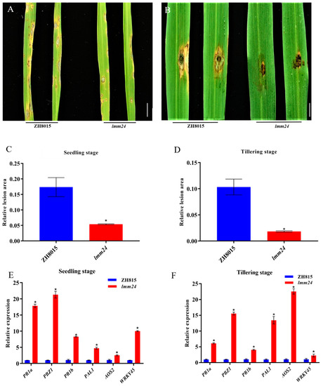 Previous studies indicated that some LMMs show enhanced resistance to fungal and bacterial pathogens. To determine whether lmm24 also confers higher resistance to pathogens, we employed the leaf spraying (seedling stage) and punch inoculation (tillering stage) methods to infect ZH8015 and lmm24 plants with the virulent M. oryzae isolate 12-144-1-1 (Figure 4A,B). Seedlings of both the mutant and ZH8015 showed susceptibility, but the morbidity rate of ZH8015 was more serious than that of the mutant. ZH8015 was obviously susceptible at the tillering stage while the mutant was minimally susceptible to disease. The statistical results of lesion area in the two growth stages showed that ZH8015 had significantly higher areas with lesions than the mutant (Figure 4C,D), indicating that lmm24 enhanced resistance to M. oryzae. To determine the mechanism of enhanced resistance of lmm24, we investigated the transcription level of PR genes (PR1a, PBZ1, PR1b, PAL1, AOS2, WRKY45) in ZH8015 and lmm24 (Figure 4E,F); these genes were all significantly upregulated in lmm24. The same experiment was performed using Ubiquitin as a reference gene. Expression levels of PR genes were also significantly greater in lmm24 than in ZH8015 (Figure S3). Together, these results suggested that the lmm24 mutant gene triggered a defense response to M. oryzae, which led to enhanced disease resistance associated with lesion formation in lmm24.