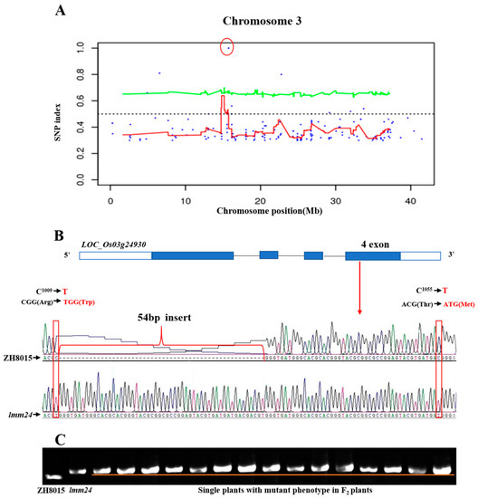 Candidate region and structure of LMM24. (A) SNP index Manhattan plot of chromosome 3. Candidate gene sites are shown in the red circle. (B) Structure and mutation site of lmm24. Four exons and three introns are indicated by blue rectangles and black lines. Two C to T point and 54 bp insertion mutation were identified in the fourth exon. Sequence analysis of the mutation site in plants of ZH8015 and lmm24. (C) Agarose gel electrophoresis using a molecular marker at the insertion site. Agarose is 2%. The fragment corresponding to ZH8015 is the size of the PCR product without insertion mutation. The fragment corresponding to lmm24 is the size of the PCR product with the insertion mutation.