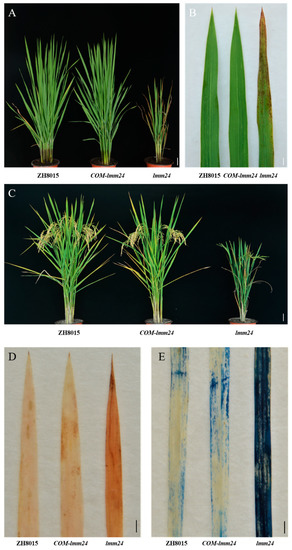 Genetic complementation of LMM24. (A) lmm24 plant transformed with the genomic sequence of ZH8015 (COM-lmm24) was completely recovered to the ZH8015 phenotype at tillering stage. (B) Leaves phenotype of ZH8015, transgenic plant and lmm24. (C) The phenotype of ZH8015, transgenic plant and lmm24 at harvest period. (D) DAB staining experiment. (E) Evans blue staining analysis. Scale bar: 10 cm in (A,C), 2 cm in (B),1 cm in (D,E).