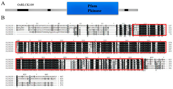 Predicted domains of OsRLCK109 and multiple sequence alignment. (A) Prediction of OsRLCK109 protein domains on smart website, blue rectangular region indicates the kinase domain. (B) Protein sequence alignment of OsRLCK109 and four other RLCKs, the highly conserved kinase domain is shown in the red box.