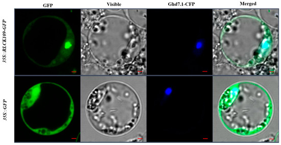 Subcellular localization of OsRLCK109. 35S::RLCK109-GFP, RLCK109 fused to GFP; 35S::GFP, empty GFP; Ghd7.1-CFP, nucleus marker. Scale bar: 2 μm.