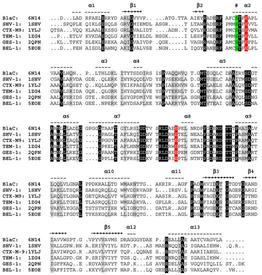 - Ambler, R.P.; Coulson, A.F.; Frere, J.M.; Ghuysen, J.M.; Joris, B.; Forsman, M.; Levesque, R.C.; Tiraby, G.; Waley, S.G. A standard numbering scheme for the class A beta-lactamases. Biochem. J. 1991, 276, 269–270. [Google Scholar] [CrossRef]