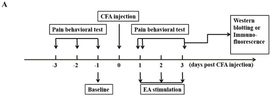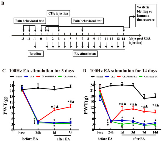 All rats in CFA + 100 Hz EA group were treated with the EA stimulus. Zusanli (ST36) and Kunlun (BL60) acupoints were taken from the bilateral legs of the rats. Acupuncture needles, 0.25 mm * 13 mm were used in this study. The needles were inserted into the acupoints at a depth of 5 mm and then stimulated by HANS Acupuncture Point Nerve Stimulator (HANS-200A Huawei Co., Ltd., Beijing, China). The parameters of the stimulator were as follows: 100 Hz, 0.5–1.5 mA (initial strength 0.5 mA, increased by 0.5 mA every 10 min) for a total of 30 min. The stimulus was conducted once daily in a period of 3 or 14 days. The rats in the CFA group were only given the same fixed time as the EA group. No treatment was performed in the control group. The CFA + sham EA group animals received needle insertion subcutaneously into ST36 and BL60 (1 mm in depth). The needles were connected to the electrodes without electrical stimulation. After finishing the EA or sham EA stimulation, the PWT was measured immediately.