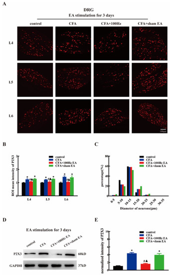 The 100 Hz EA stimulation for 3 days repressed the up-regulation of P2X3 in the L4-6 dorsal root ganglions (DRG) of inflamed rats. (A) Representative images of L4-6 DRG immunofluorescence staining from the control, CFA, CFA+100 Hz EA and CFA + sham EA groups. Scale bars = 100 μm. (B) Mean intensity analysis of P2X3-ir in L4-6 DRG in each group. Data are presented as the mean ± SEM, n = 3. (C) Size distribution of P2X3 in L4-6 DRG in different groups. (D) Representative western blotting images of L4-6 DRG in each group. E. Relative protein level of P2X3 in rat L4-6 DRG from different groups. Data are presented as the mean ± SEM, n = 6. * P < 0.05, compared with the control group; # P < 0.05, compared with the CFA group; ▲ P < 0.05, compared with the CFA + sham EA group.
