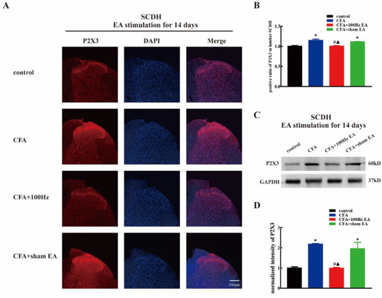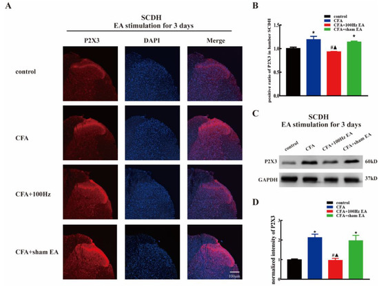 P2X3 is purinoceptor with ion channel activity in response to extracellular adenosine triphosphate (ATP) [8,9]. P2X3 is highly expressed in small- and medium-sized nociceptors of dorsal root ganglions (DRGs) and has been associated with pain response in multiple animal pain models, including the bone cancer pain model, chronic constriction nerve injury (CCI) model, spared nerve injury (SNI) model, and the CFA model [10,11,12,13]. P2X3 can be found in the peripheral terminals where it senses the ATP leaked from damaged tissues or released from inflammatory cells [14]. In addition, P2X3 is distributed in the central terminals of nociceptors, indicating that P2X3 might play presynaptic roles in the spinal cord dorsal horn [15]. Indeed, blockage of P2X3 at the spinal cord level significantly reduced postsynaptic neuronal hyperexcitability in a model of bone cancer pain [16]. Previous studies demonstrated that the expression of P2X3 was upregulated by CFA induced inflammation and CCI in the DRG and spinal cord dorsal horn (SCDH), respectively [7,17]. Notably, EA stimulation was reported to attenuate CFA (100 Hz) and CCI (15 Hz) induced pain hypersensitivity [18,19]. We speculated that EA stimulation modulated P2X3 levels in pain pathways and then exerted analgesic actions on chronic inflammatory pain.