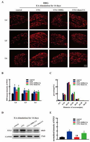 Clinical studies and scientific studies have proved that EA has eminent analgesic effects, but the mechanism of EA analgesia is still an open question [26,27,28]. Cheng RS et al. reported that 4 Hz EA attenuated pain through the modulation of endorphins, whereas the analgesic effect of 200 Hz EA may be mediated through serotonin [29]. Wang Y et al. demonstrated that 100 Hz EA relieved inflammatory pain by increasing CXCL10, which chemoattracted opioid-containing macrophages and mediated the anti-nociceptive effect in the model of inflammatory pain [30]. Kim H W et al. proposed that 1 Hz electroacupuncture suppressed carrageenan-induced paw inflammation via sympathetic post-ganglionic neurons, while inflammation was restrained by 120 Hz EA in connection with the sympathoadrenal medullary axis [31]. Recently, increasing evidence has shown that the analgesic effect of EA is closely related to its regulation of ion channels in sensory neurons [32,33]. Particularly, increased attention has been paid to P2X3, which has been regarded as a potential target of inflammatory pain and neuropathic pain [34,35].