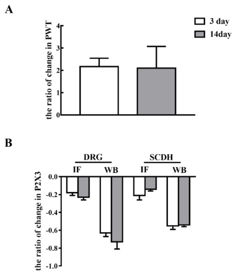 Short-term and long-term EA stimulation treatments exerted comparable effects on pain hypersensitivity and P2X3 expression. (A) The ratio of changes in PWT after 100 Hz EA stimulation for 3 and 14 days. (B) The ratio of changes in P2X3 after 100 Hz EA stimulation for 3 and 14 days. Data are presented as the mean ± SEM.