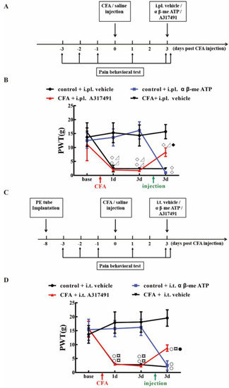 The effect of intraplantar injection or intrathecal injection of α β-me ATP (P2X3 agonist) and A317491 (P2X3 antagonist) on the PWT. (A) Schematic flow diagram of the intraplantar injection of α β-me ATP (P2X3 agonist) and A317491 (P2X3 antagonist). (B) The effect of intraplantar injection of α β-me ATP (P2X3 agonist) and A317491 (P2X3 antagonist) on the PWT. Data are presented as the mean ± SEM, n = 5. ◇ P < 0.05, compared with the control + intraplantar injection (i.pl.) vehicle; ⊿ P < 0.05, compared with the control + i.pl. α β-me ATP; ◆ P < 0.05, compared with the CFA + i.pl. vehicle group. (C) Schematic flow diagram of the intrathecal injection of α β-me ATP (P2X3 agonist) and A317491 (P2X3 antagonist). (D)The effect of intrathecal injection of α β-me ATP (P2X3 agonist) and A317491 (P2X3 antagonist) on the PWT. Data are presented as the mean ± SEM, n = 5. ○ P < 0.05, compared with the control + intrathecal injection (i.t.) vehicle; ¤ P <0.05, compared with the control + i.t. α β-me ATP group; ● P < 0.05, compared with the CFA + i.t. vehicle.