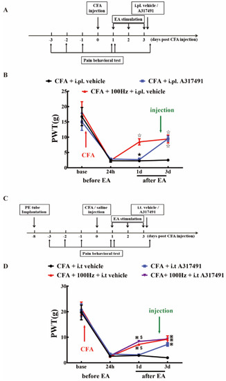 P2X3 inhibition contributed to the analgesic effects of 100 Hz EA on CFA-induced inflammatory pain. (A) Schematic flow diagram of the intraplantar injection of P2X3 antagonist A317491. (B) The effect of intraplantar injection of A317491 on the PWT. Data are presented as the mean ± SEM, n = 6. ☆ P < 0.05, compared with the CFA + i.pl. vehicle group; ★ P < 0.05, compared with the CFA + 100 Hz + i.pl. vehicle group. (C) Schematic flow diagram of the intrathecal injection of A317491. (D) The effect of intrathecal injection of A317491on the PWT. Data are presented as the mean ± SEM, n = 6. ※ P < 0.05, compared with the CFA + i.t vehicle group; $P < 0.05, compared with the CFA + 100 Hz+ i.t vehicle group.
