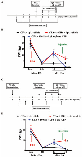 In part two, the involvement of P2X3 in EA-mediated pain modulation was explored through the administration of a P2X3 antagonist (A317491) or agonist (α β-me ATP) via intraplantar injection (i.pl.) or intrathecal injection (i.t.). Rats were randomly assigned to eight groups (n = 5/group), i.e., (1) control + i.pl. vehicle group, (2) control + i.pl. α β-me ATP group, (3) CFA + i.pl. A317491 group, (4) CFA + i.pl. vehicle group, (5) control + i.t. vehicle group, (6) control + i.t. α β-me ATP group, (7) CFA + i.t. A317491 group, and (8) CFA + i.t. vehicle group. For i.pl., antagonists or agonists were administered ipsilaterally on day three after CFA injection, and paw withdrawal thresholds (PWT) were recorded according to the schedule (Figure 7A). For i.t., antagonists or agonists were delivered via implanted PE tubes. PWT was recorded according to the schedule (Figure 7C).