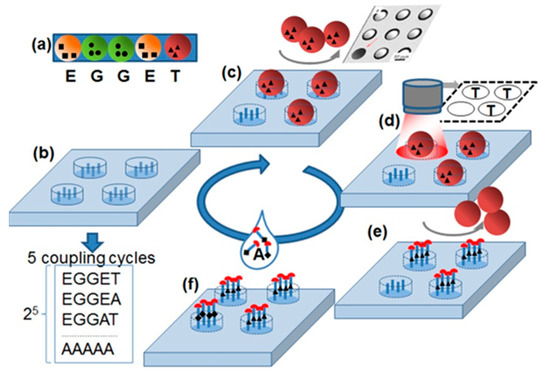 Stochastic substitutional arrays with amino acids particles. (a) Each amino acid particle carries a special amino acid with protecting groups. (b) Functionalized substrate is exposed to (c) one kind amino acid particles. The particles fill in the cavities stochastically. (d) The particle pattern is detected with a camera. (e) The amino acids are extracted from the particles and coupled inside the cavities via peptide bonds. The particles are removed from cavities. (f) The slide is exposed to a solution containing the amino acid alanine. After the removal of protecting groups (red half circles), a new cycle can be started. The repetition of 5 cycles results in the synthesis of peptides with all possible Ala substitutions in original sequences TEGGE.