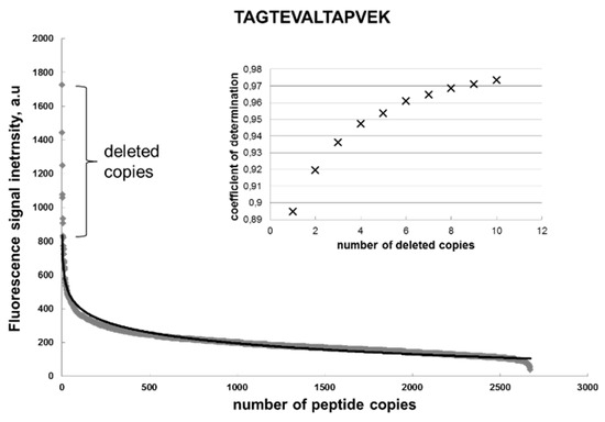Distribution of the fluorescent signal intensity of the identical peptides (gray diamonds) and its logarithmic approximation (black) on a chip. The curves represent the Renaissance distribution. y = −92ln(x) + 834; R2 = 0.895. The inlet shows an increase of the R2 by deleting the copies from the original distribution of the fluorescent intensity.