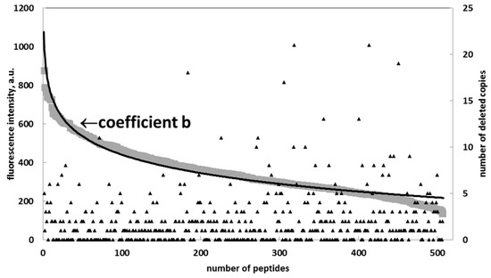 where a = 92, b = 834, and the coefficient of determination is R2 = 0.895. Formula (1) represents a general function that is defined as the Renaissance distribution. In an ideal case, all the signals would have the same fluorescent intensity. However, because of the statistically non-ideal amino acid extraction from the particles, the majority of signals are close to the chip surface background value of approx. 200 a.u., and only few high-intensity signals are demonstrated by the first 50 peptides. Formula (1) fit the signal distributions for all substitutions of the target sequence very well, with coefficients of determination > 0.8. Interesting to note is that removal of the signals with maximal intensity significantly increased the coefficient of determination to R2 = 0.97. Such deleted points will be considered as artifacts.