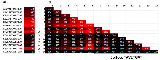 (a) Single and (b) double Ala substitutions of the target peptide KEVPALTAVETGAT. The number indicates the fluorescence intensity. In the table (b), the position (x,y) means that Ala was placed in position x and position y in the target peptide. The intensity of the signals reveals a binding motif KXXXXXXVETGXT (c), indicating the location of the target peptide in the capsid protein VP1 of the poliovirus.