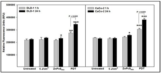 - Sekhejane, P.R.; Houreld, N.N.; Abrahamse, H. Multiorganelle localization of metallated phthalocyanine photosensitizer in colorectal cancer cells (DLD-1 and CaCo-2) enhances efficacy of photodynamic therapy. Int. J. Photoenergy 2014. [Google Scholar] [CrossRef]