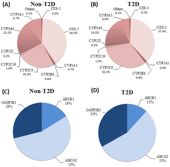 As illustrated in Figure 1A,B, the most expressed mRNAs in both study groups for drug metabolizing enzymes were CES-2, CYP2C9, and CYP3A. Figure 1C,D show that the most abundant drug transporters in the duodenum for non-T2D and T2D groups was ABCG2, which is followed by OATP2B1 and ABCB1.