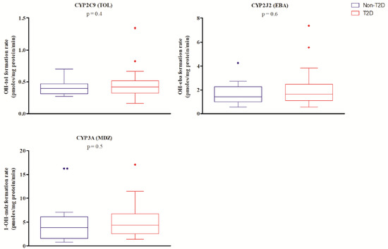 ). Each experiment was performed three times in triplicates, means are displayed for all individuals, and the Mann Whitney t-test was performed on overall mean values. Figure S2. Correlations between mRNA expression levels as N-fold differences relative to the average expression of housekeeping genes and calibrator (2−ΔΔCT) and metabolic activities expressed as metabolite formation rates (pmoles mg protein−1 min−1) in both study groups for CYP2C9 (OH-Tol), CYP2J2 (OH-Eba), CYP3A4, and CYP3A5 (1-OH-Mdz). Patients with T2D are displayed with red squares (