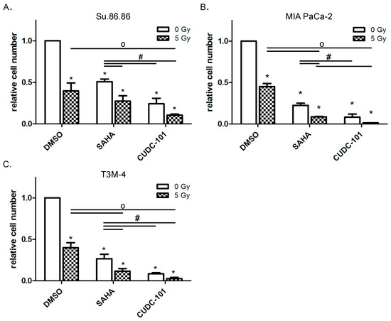 CUDC-101 more efficiently blocked proliferation than SAHA. Pancreatic cancer cell lines Su.86.86 (A), MIA Paca-2 (B) and T3M-4 (C) cells were treated with SAHA (1.5 µM) or CUDC-101 (0.5 µM) for 24 h, then cells were irradiated with 5 Gy or sham irradiated. After another 72 h cells were harvested and cell numbers were determined by counting. Histograms show the mean ± SEM of three independent experiments. For statistical analysis ANOVA was performed with post hoc Bonferroni multiple comparisons. * Indicates comparison with DMSO control, p < 0.01; # indicates comparison between SAHA and CUDC-101, p < 0.05; o indicates comparison between irradiated samples, p < 0.05.