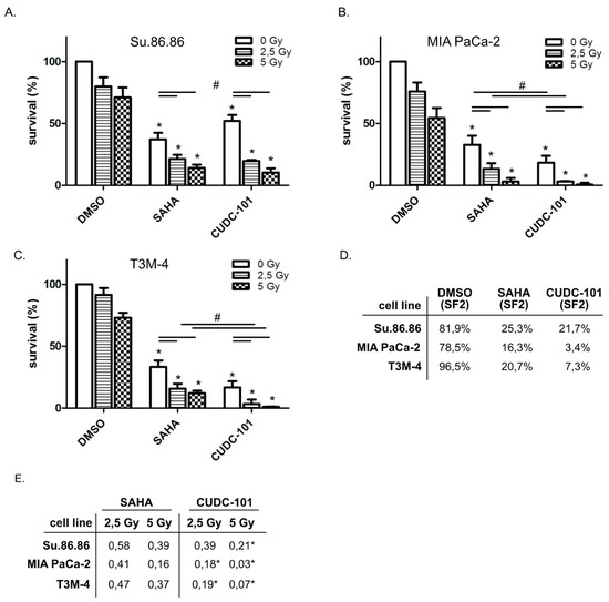 Clonogenic survival decreased more efficiently by combined CUDC-101 and radiation than by SAHA and radiation. Su.86.86 (A), MIA PaCa-2 (B) and T3M-4 cells (C) were treated with SAHA (1.5 µM) or CUDC-101 (0.5 µM) for 24 h, then cells were irradiated with 0, 2.5 or 5 Gy. After 10 days colonies bigger than 50 cells were counted. The mean of three independent experiments ± SD is shown. For statistical analysis, ANOVA was performed with post hoc Bonferroni multiple comparisons. * Indicates comparison with DMSO control, p < 0.05; # indicates comparison between SAHA and CUDC-101, p < 0.05. (D) Survival fractions after irradiation with 2 Gy. (E) Mean n-fold changes between inhibitor treatment compared to combined inhibitor/radiation treatment, * indicates comparison between SAHA and CUDC-101 treatment at the indicated dose, p < 0.05).