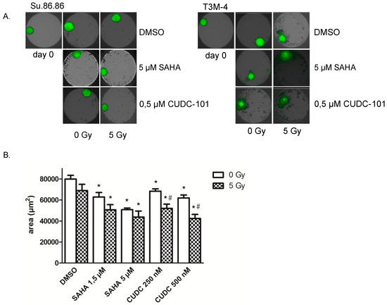 (A) Growth of 3D-microtissues was delayed after HDAC inhibitor and radiation treatment. Microtissues were grown from Su.86.86 (left) and T3M-4 (right) cells for 3 days, after that SAHA (1.5 and 5 µM) and CUDC-101 (0.25 and 0.5 µM) were added, another 24 h later cells were irradiated with 0 or 5 Gy. After 6 days pictures were taken with the high content screening system Operetta. (B) Areas of Su.86.86 microtissues were determined with the Operetta system. Data represent the mean of at least three independent experiment ± SD. For statistical analysis, ANOVA was performed with post hoc Bonferroni multiple comparisons. * Indicates comparison with DMSO control, p < 0.01, # indicates comparison between irradiated and non-irradiated CUDC-101 samples p < 0.05.