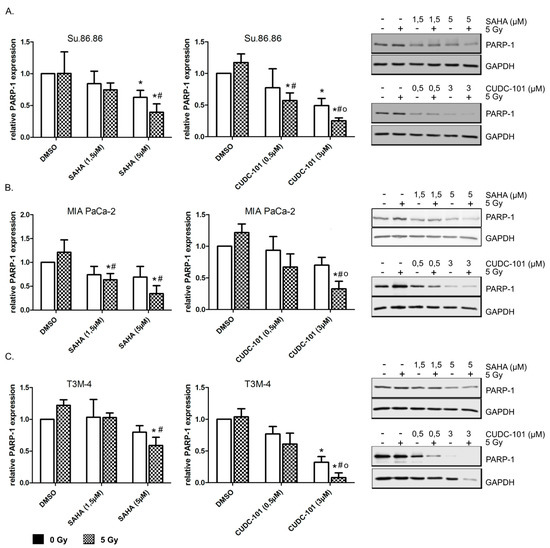 Radiation promoted CUDC-101 induced PARP-1 reduction. Su.86.86 (A), MIA PaCa-2 (B) and T3M-4 (C) cells were treated with SAHA or CUDC-101 for 24 h, then cells were irradiated with 5 Gy. 24 h after irradiation full length PARP-1 was quantified by western blot. (Left) relative PARP-1 amounts normalized to GAPDH and control amounts. Data represent the mean of at least three independent experiment ± SD. For statistical analysis ANOVA was performed with post hoc Bonferroni multiple comparisons. * Indicates comparison with DMSO control, p < 0.01, # indicates comparison with DMSO, 5 Gy, p < 0.05; o indicates comparison with CUDC-101, 0 Gy, p < 0.05. (right) representative western blots.