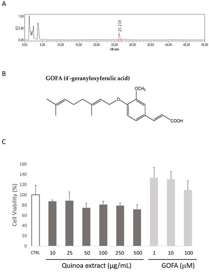 (A) HPLC chromatogram of quinoa roasted seeds ethanolic extract. Peak with Rt of 26.2 min identifies 4′-geranyloxyferulic acid (GOFA). (B) Chemical structure of GOFA. (C) The effects of the quinoa extract (10–500 µg/mL) and GOFA (1–100 µM) on HCT116 cell viability, measured by the MTT assay (24 h). Data are expressed as the mean ± SEM of at least three independent experiments, performed in triplicate.