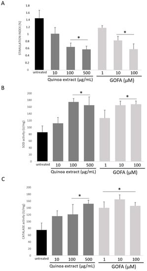 The effect of quinoa extract and GOFA on reactive oxygen species (ROS) production and anti-oxidative enzyme activity in HCT116 cells. (A) ROS production was measured by NBT assay. (B) Superoxide dismutase (SOD) and (C) catalase activity were analyzed. The results are representative of three different assays. Data are expressed as the mean ± SD. * p < 0.05 vs. untreated cells.