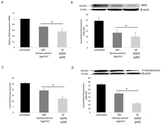 The expression of the inducible isoform of NOS and/or its catalytic activity increases in oxidative stress condition, as well as in inflammation. Thus, compounds that can selectively inhibit irregular expression of iNOS might be potential antioxidant and anti-inflammatory agents []. Our experimental study evidenced an elevated mRNA and protein expression of iNOS in HTC 116 cells (Figure 3A,B). In this context, it is interesting to note that real-time data and immunoblotting, point out that quinoa extract and GOFA induced a significant down regulation of iNOS. Moreover, NO production was also significantly decreased in quinoa and GOFA treated cells (Figure 3C).