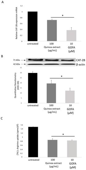 The effect of quinoa extract and GOFA on l-arginine transport in HCT116 cells. (A) mRNA expression of the CAT-2B. (B) Representative Western blot and densitometric analysis of CAT-2B expression. (C) (3H) l-arginine uptake. Data are expressed as the mean ± SD. * p < 0.05 vs. untreated cells.