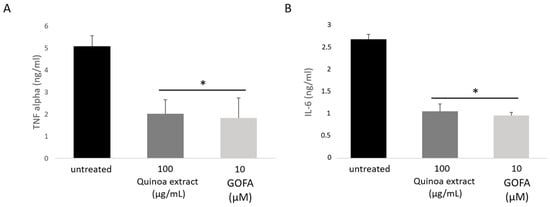 The effect of quinoa extract and GOFA on TNF-α and IL-6 production in HCT-116 cells. TNF-α (A) and IL-6 (B) levels were measured by ELISA. Values are means standard deviations; n = 3, * p < 0.05 vs. untreated cells.