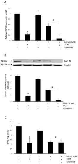 To assess whether the GOFA regulates iNOS by interfering with the intracellular concentration of l-arginine in HCT116 cells, the transporter CAT-2B was silenced with a siRNA specific for the coding sequence. Cells were transfected with scrambled or CAT-2B siRNA. Data presented in Figure 6A show the expression of CAT-2B transporter, evident in untreated cells, in comparison to cells transfected with CAT-2B siRNA in which it was abolished. The observed changes of gene expression were associated with changes in protein levels (Figure 6B). Furthermore, the cellular uptake of arginine decreased in cells silenced for CAT-2B compared to untreated ones (Figure 6C).