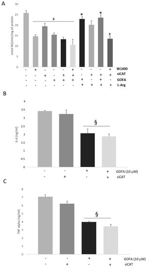 Finally, the expression of pro-inflammatory cytokines, such as IL-6 and TNF-α, was not affected by the expression of CAT-2B, as our genes were induced alike both in untreated and CAT-2B-silenced cells (Figure 7B,C). Our results suggest that GOFA inhibits iNOS activity through downregulation of CAT-2B.
