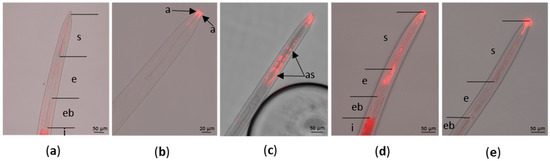 Fluorescence microscopy observations showing the Cy3-siRNA uptake by X. index. (a) control nematode incubated for 48 h without Cy3-siRNA; (b–e) nematode soaked with Cy3-siRNA; (b–d) 48 h incubation; (e) 1 h incubation; all the incubations were done in mineral water. a: amphids; s: stylet; e: esophagus; eb: esophageal bulb; i: intestine; as: amphid sheath.