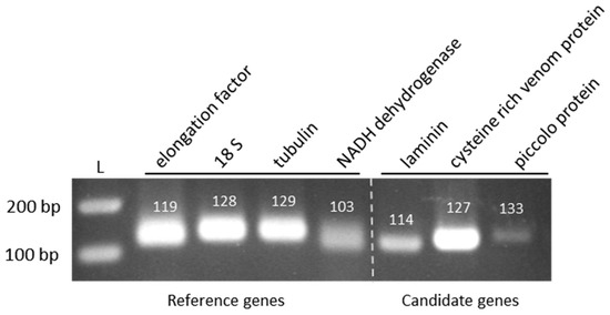 Control of expression of the selected reference and candidate genes in X. index by RT-PCR. Amplification of the specific mRNA was performed on total RNA extracted from X. index. The amplified DNA fragments were loaded on a 2% agarose gel and visualized by UV after ethidium bromide staining. The expected size of each fragment (in base pair, bp) is mentioned. L: ladder in bp.