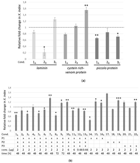 Silencing efficiency of X. index targeted genes after siRNA in vitro acquisition. (a) Silencing of laminin, cysteine rich venom protein, and piccolo protein genes after siRNA acquisition (2 µg of siRNA) for 48 h. (b) Silencing of the piccolo protein gene in different experimental conditions (Cond.). The first three conditions are those presented in (a). The conditions varied depending on the siRNA used (P1, P2, and P3 are the three siRNA targeting piccolo-mRNA used in mixture or individually), the concentration (conc.) of siRNA used in the artificial medium and the time (h) of incubation with the nematodes. Letters in subscript (A-K) represent independent experiments. Each bar represents the relative fold change of the gene expression in a pool of 90 nematodes ± standard deviation of technical triplicates. Asterisks indicate significant differences between nematodes fed with the negative-control siRNA and nematodes that have acquired specific siRNA molecules (Student’s t-test). * p-value < 0.05; ** p-value < 0.01; *** p-value < 0.001. The reference genes stability was controlled in each experiment and is shown in Figure S1.