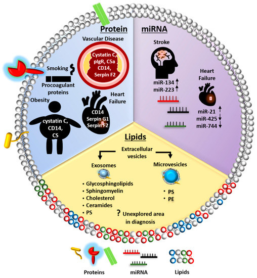 Schematic diagram illustrating EVs as an alternative source of biomarkers in cardiovascular disease (CVD). Extracellular vesicle (EV) proteins, such as CD14, cystatin C and coagulation-related proteins including Serpin G1 and Serpin F2, have been proposed as novel biomarkers for diagnosis and prognosis of heart failure, vascular disease, and stroke. Conventional CVD risk factors, such as obesity and smoking, have been associated with EV protein contents, including CD14, cystatin C, and procoagulant proteins. Certain EV miRNAs have also been identified as novel diagnostic and prognostic biomarkers for stroke and heart failure. Five EV miRNAs are listed as representatives. EV lipids, however, remain largely unexplored in the diagnosis or prognosis of CVD. CVD, cardiovascular diseases; CS, complement system; C5a, complement factor 5a; pIgR, polygenic immunoglobulin receptor; PS, phosphatidylserine; PE, phosphatidylethanolamine.