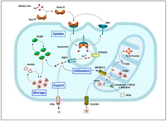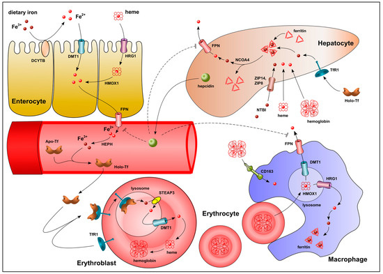 - Muckenthaler, M.U.; Rivella, S.; Hentze, M.W.; Galy, B. A red carpet for iron metabolism. Cell 2017, 168, 344–361. [Google Scholar] [CrossRef] [PubMed]