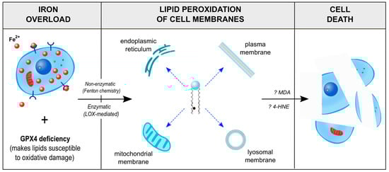 - Feng, H.; Stockwell, B.R. Unsolved mysteries: How does lipid peroxidation cause ferroptosis? PLoS Biol. 2018, 16, e2006203. [Google Scholar] [CrossRef] [PubMed]