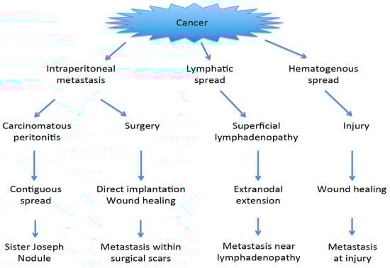 Skin metastases usually develop at the umbilicus, surgical scars, including laparoscopic port sites, and in the vicinity of metastatic lymph nodes [,,,,,,,,,,,,,,,,,,,,,,,,,,,,,,,,,,,,,,,,,,]. Skin metastases are often a late manifestation of the disease; however, in certain cases they may sometimes be the first sign of internal malignancies such as lung, renal, and ovarian cancers []. In this review, the possible mechanisms of skin metastases are discussed according to the site of appearance and the preceding medical conditions. Moreover, the roles of wound healing, inflammation, and adipose tissue in the development of skin metastases are also discussed. Skin involvement that develops as direct invasion from underlying primary tumors, such in breast or prostate cancer, is not discussed in this review.