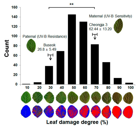Distribution of the degree of leaf damage under high-intensity ultraviolet-B (UV-B) irradiation in the recombinant inbred line (RIL) population of Cheongja 3 × Buseok. X-axis indicates the degree of leaf damage from 10% to 100%. For each degree of damage, RGB (red-green-blue) and two-color-transformed images of a representative injured leaf are shown. Blue and red in the two-color-transformed image indicate intact and damaged parts of the leaf exposed to UV-B irradiation, respectively. ** indicates a significant difference between Cheongja 3 and Buseok at p < 0.01 based on a Student’s t-test.