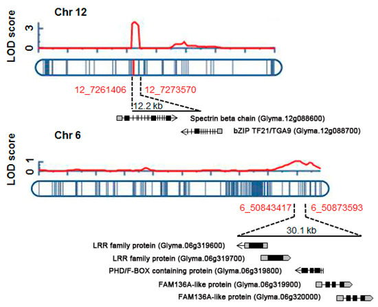 LOD peaks and chromosomal locations of two QTLs UVBR12-1 and UVBR6-1 for resistance to high-intensity UV-B irradiation on chromosome (Chr) 12 and Chr 6. Red curves present LOD score distribution of detected QTLs on Chr 12 and Chr 6. These loci contain two and five protein-coding genes, respectively.