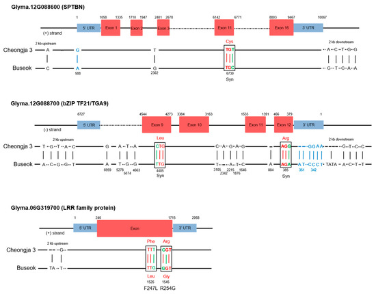 Structures of three genes encoding SPTBN (Glyma.12G088600), bZIP TF21/TGA9 (Glyma.12G088700), and LRR family protein (Glyma.06G319700), and single nucleotide polymorphisms (SNPs) in the mapping parents Cheongja and Buseok. Exons and untranslated regions (UTRs) are indicated by red- and blue-filled boxes, respectively. SNP positions, nucleotide replacements, and amino acid substitutions between Cheongja 3 and Buseok are presented. One and two SNPs in exons of SPTBN (Glyma.12G088600) and bZIP TF21/TGA9 (Glyma.12G088700), respectively, were synonymous. The SNPs T/G and C/G in exons of Glyma.06G319700 (LRR family protein) caused amino acid replacements of Phe to Leu and Arg to Gly at the 247th and 254th residues, respectively.