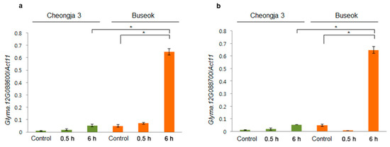 Expression levels of SPTBN (Glyma.12G088600) (a) and bZIP TF21/TGA9 (Glyma.12G088700) (b) in Cheongja 3 (green) and Buseok (orange). Y-axis represents the relative transcript abundance determined by qRT-PCR. Control, 0.5, and 6 h on the X-axis refer to 0, 0.5, and 6 h UV-B irradiation, respectively. Error bars represent the standard error for three independent replicates. *, significant at p < 0.05.