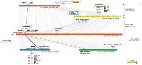 The QTL with the highest LOD, UVBR12-1, on Chr 12 was located near SCN39-4, a QTL for the reaction to the soybean cyst nematode (SCN; Heterodera glycines) linked to Sctt009 (Table 1). The genomic region (Chr12:6,657,383…11,713,748) harboring UVBR12-1 and SCN39-4 had a duplicated block on the same chromosome (Chr12:34,009,158…36,919,294), carrying QTLs for drought and flood tolerance (Drought tolerance 6-4 and Flood tolerance 7-1, respectively) linked to Sat 175 (Figure 5). Three homeologous blocks that show syntenic relationships with the two duplicated regions on Chr 12 were also detected on Chr 6, 11, and 13. The homeologous region (Chr11:24,411,218…26,359,492) on Chr 11 with a median Ks value of 0.135 probably resulted from the recent whole genome duplication (WGD) event 13 million years ago [13] and only had collinearity with the beginning of the genomic region (including only UVBR12-1) on Chr 12. This syntenic block contained six QTLs for SCN resistance, SCN 17-1, 18-2, 20-1, 23-1, 24-1, and 32-2, associated with Satt583. On Chr 13, the marker Satt554, associated with the QTL Asian soybean rust 2-3 for resistance to Asian soybean rust, resided in another duplicated region (Chr13:39,150,251…41,460,183) resulting from the recent WGD (median Ks, 0.133). In UVBR12-1, bZIP TF21/TGA9 was retained in all three duplicated regions but SPTBN was only retained in the homeologous block on Chr 11 and was lost in the other blocks (Figure 5). On Chr 6, the remaining duplicated block (Chr06:47,897,433…50,898,694) was mainly conserved with the middle part of the genomic region of UVBR12-1. This block with the UV-B resistance QTL UVBR6-1 included another UV-B-related QTL (Plant damage UV-B induced 1-2) as well as biotic stress-related QTLs, including SCN 17-3 and 20-2, and SDS 7-5 for sudden death syndrome resistance (reaction to Fusarium solani f. sp. glycines), which were associated with Satt371.